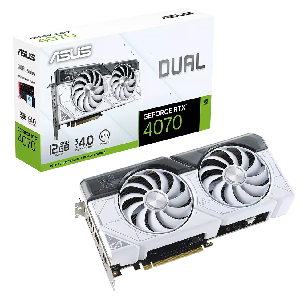 In the UAE, get the ASUS Dual GeForce RTX 4070 White Edition 12GB GDDR6X Graphics Card. It produces stunning images thanks to NVIDIA® GeForce RTXTM 4070 and 5888 CUDA cores. It provides smooth data access with 12GB GDDR6X Video Memory operating at 21 Gbps Memory Speed and a 192-bit Memory Interface. Up to four monitors can be connected to the HDMI 2.1 and DisplayPort 1.4a outputs with HDCP support. Enjoy seamless performance and stunning visuals. With this cutting-edge graphics card, you can improve your gaming and artistic endeavours.