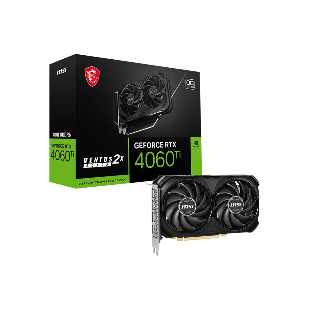 Showcasing the sleek design and advanced technology of the MSI GeForce RTX 4060 Ti VENTUS 2X BLACK 8GB OC.