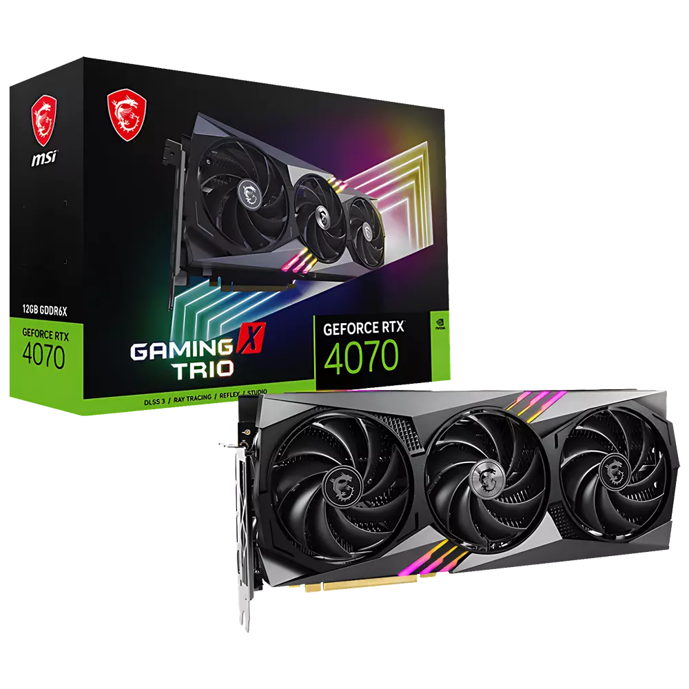 The MSI GeForce RTX 4070 GAMING X TRIO 12GB GDDR6X graphics card boasts a sleek design with RGB lighting and triple-fan cooling system, providing both aesthetics and performance.
